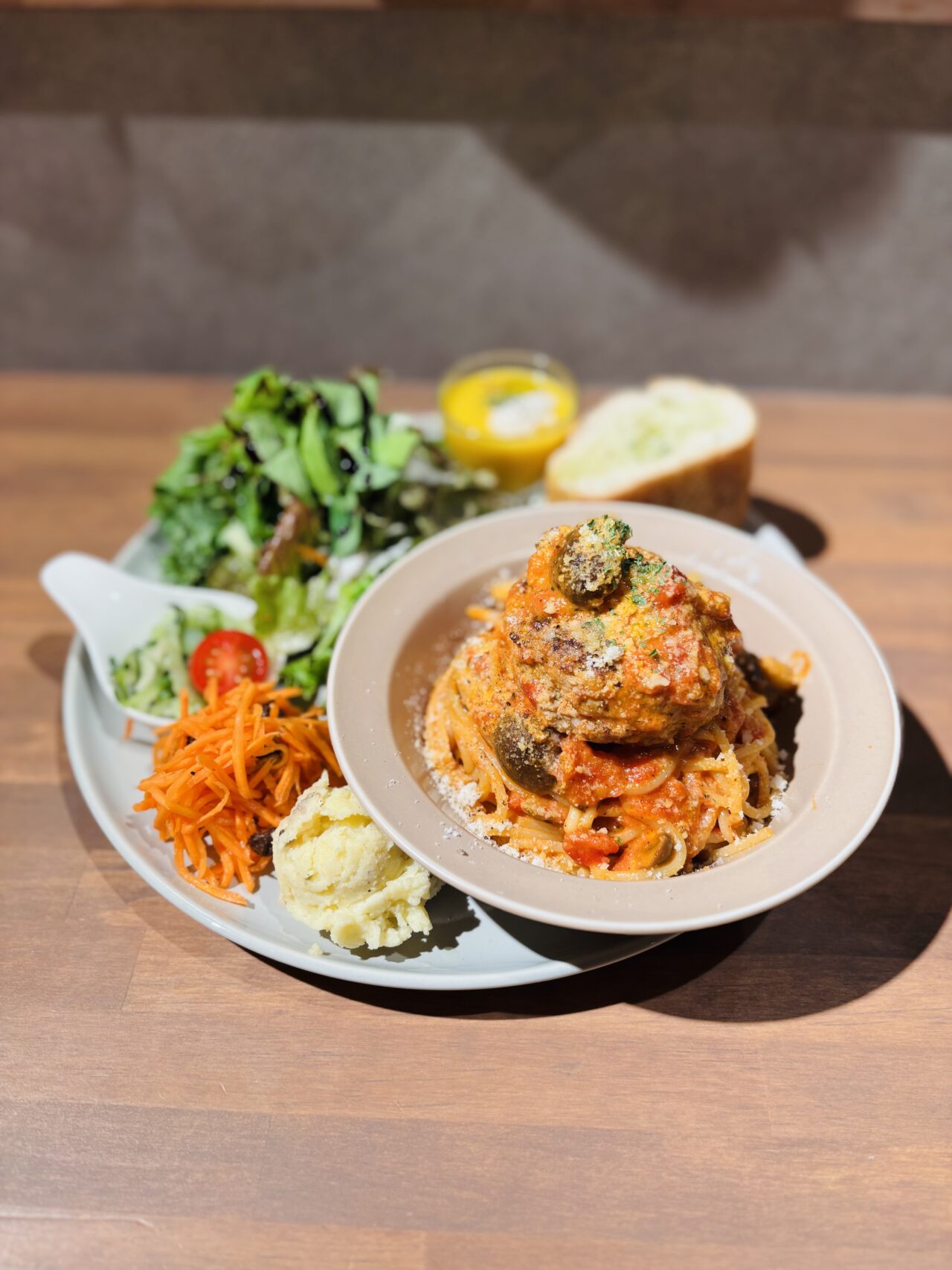 まもなくオープンから1周年を迎えるにあたり、スペシャルな1周年のイベントを開催するとのお知らせが入りました。ニコハルカフェ2025年10月11日(土)〜13日(月・祝)の3日間は、限定特別プレートランチメニューを提供。いつものプレートランチとパスタランチが1つになった、いろいろキノコのトマトクリームパスタにハンバーグを豪快に乗せたスペシャルメニュー。