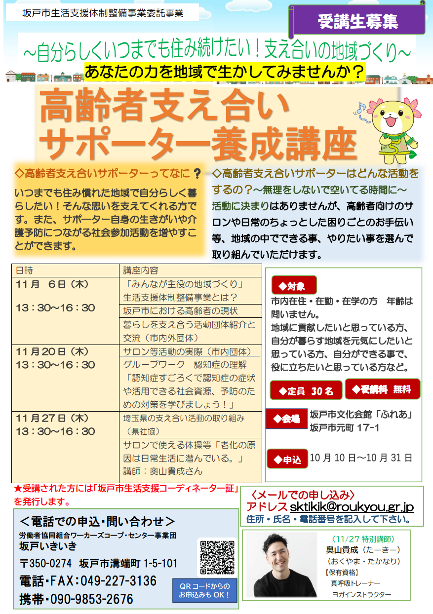 【坂戸市】あなたの力を地域で生かしてみませんか?無料で受けられる高齢者支え合いサポーター養成講座の申込受付が10月10日(金)よりスタートしました!