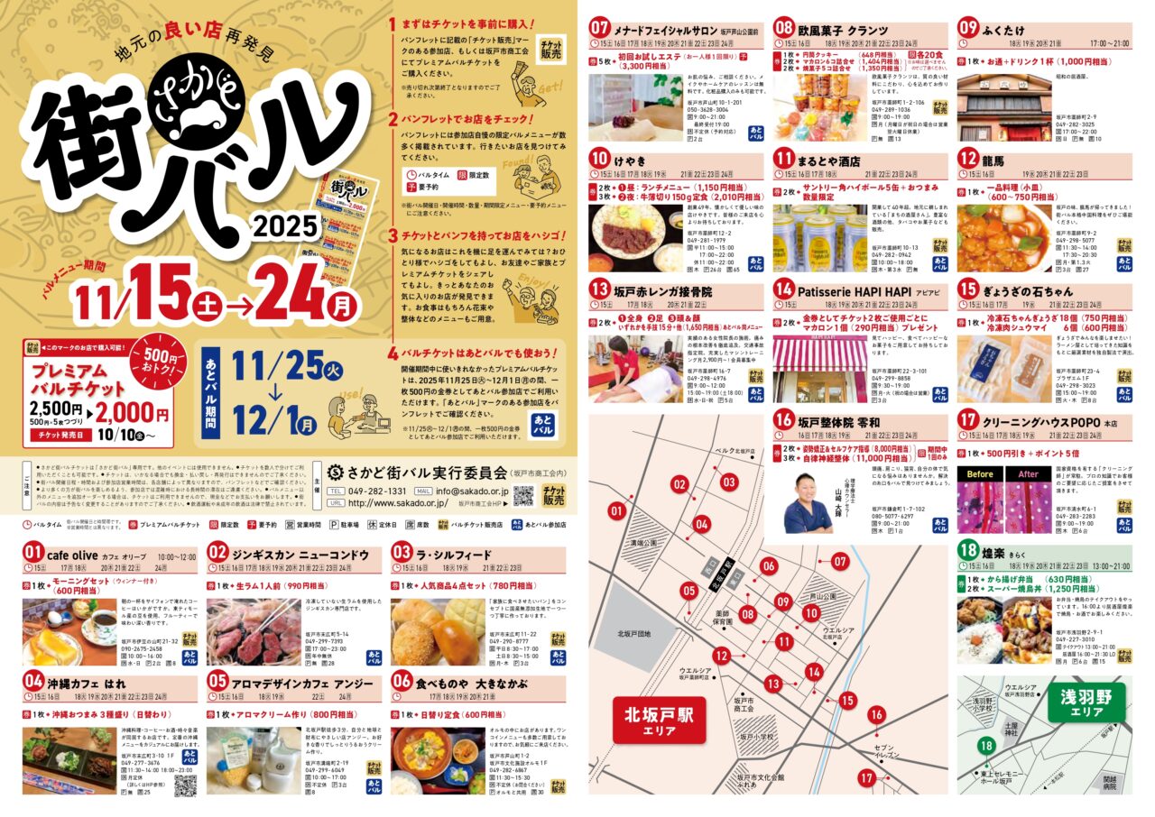 坂戸市内の飲食店などが参加し、地元のおいしいものや素敵な商品をお得に楽しむことができる「さかど街バル」の季節が2025年の今年もやってきました。