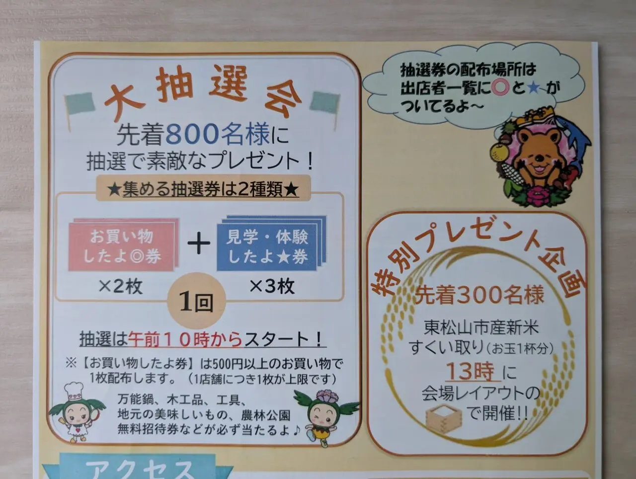 スペシャル企画として、 大抽選会を実施。出店者リストにマークのあるブースでのお買い物や見学・体験で券を集めると、先着800名の方に素敵なプレゼントが当たる抽選会に参加することができるそうです。