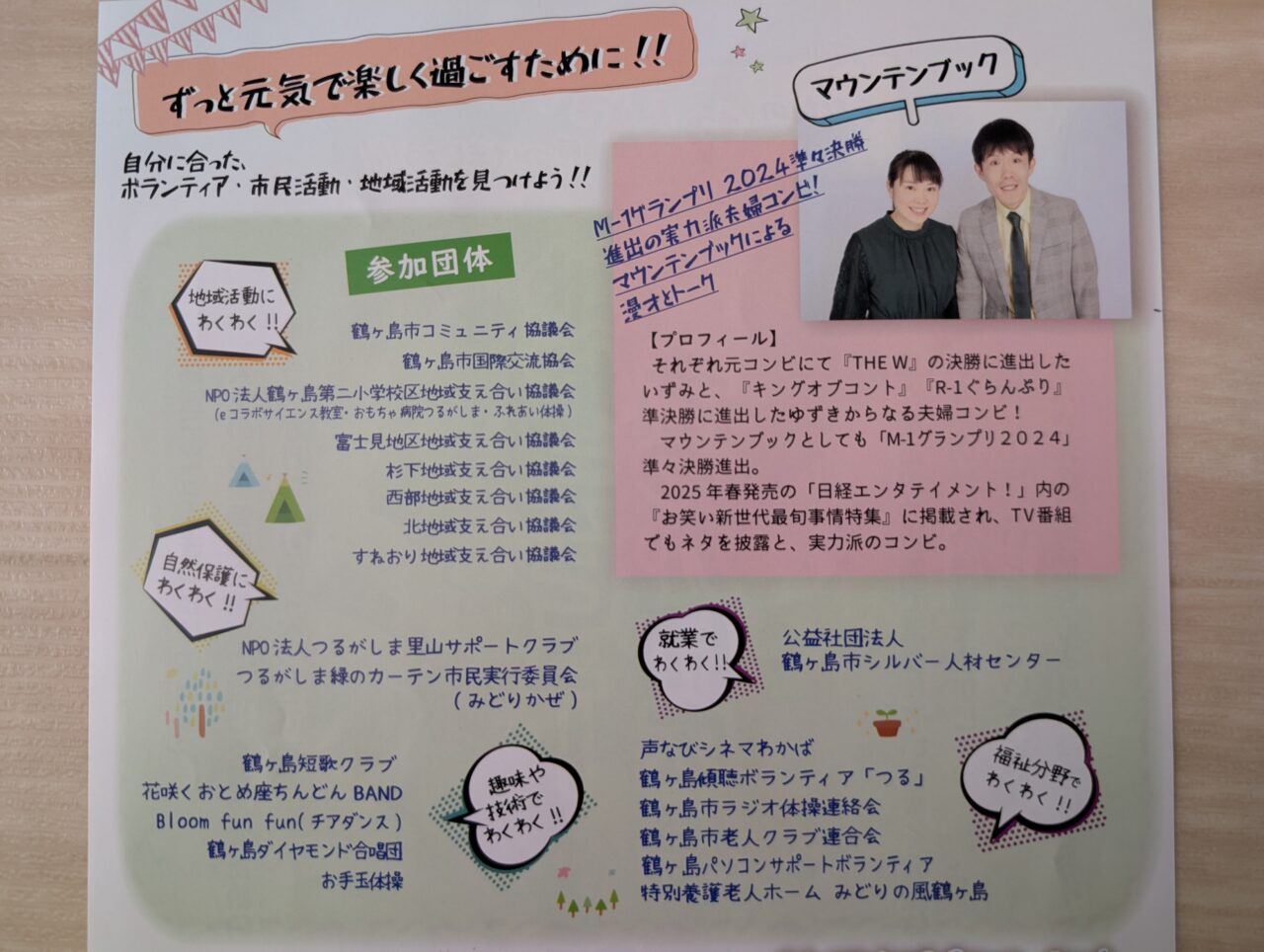 そしてさらに、2024年のM-1グランプリの準々決勝にも出場した、鶴ヶ島市ゆかりの夫婦漫才コンビ・マウンテンブックによる漫才やトークを楽しむことができるとのこと。メディアでも話題のお二人を間近で見られる貴重な機会となっています。