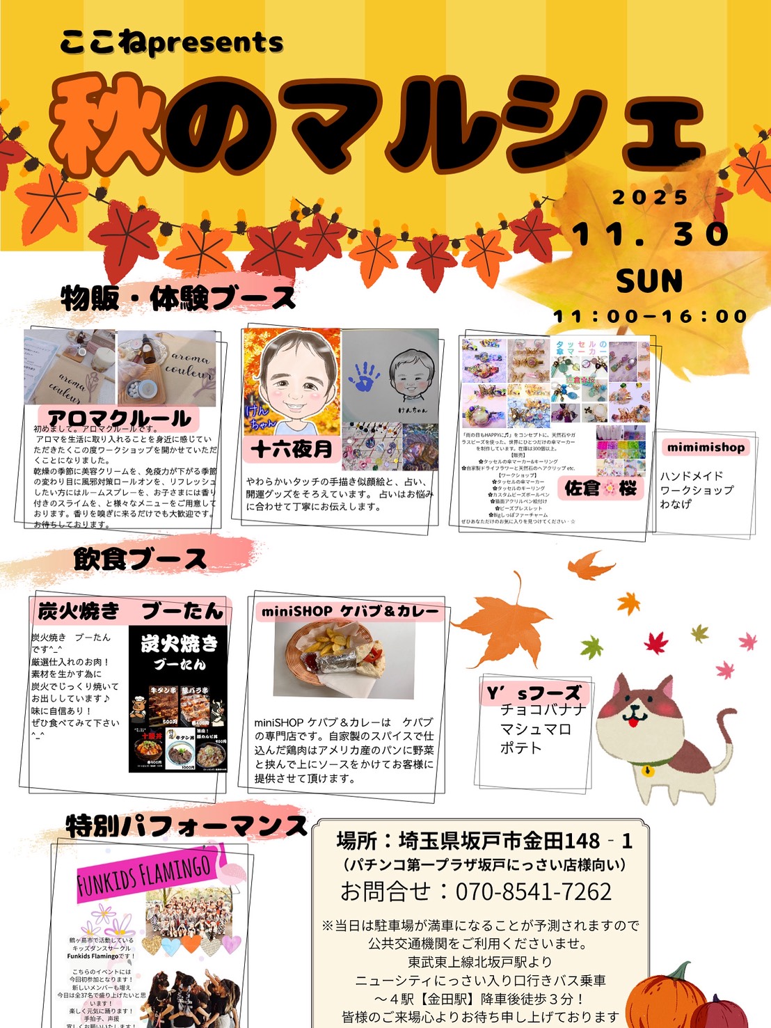 「ばんとうモール 坂戸にっさい店」内にある「コミュニティカフェ cocone」がプロデュースする初回のマルシェ「ここねpresents 秋のマルシェ」は、2025年11月30日(日)11:00〜16:00に開催されます。