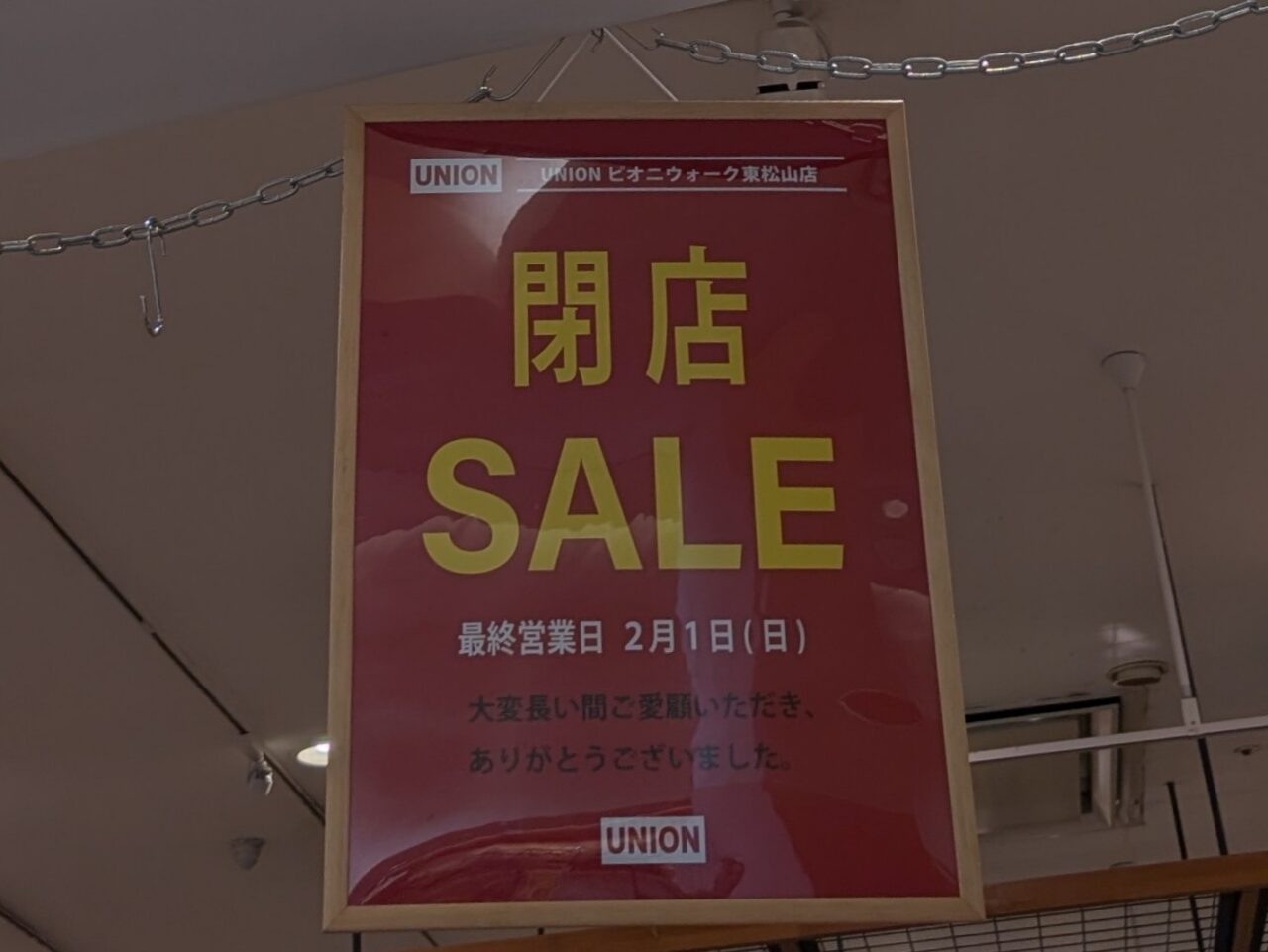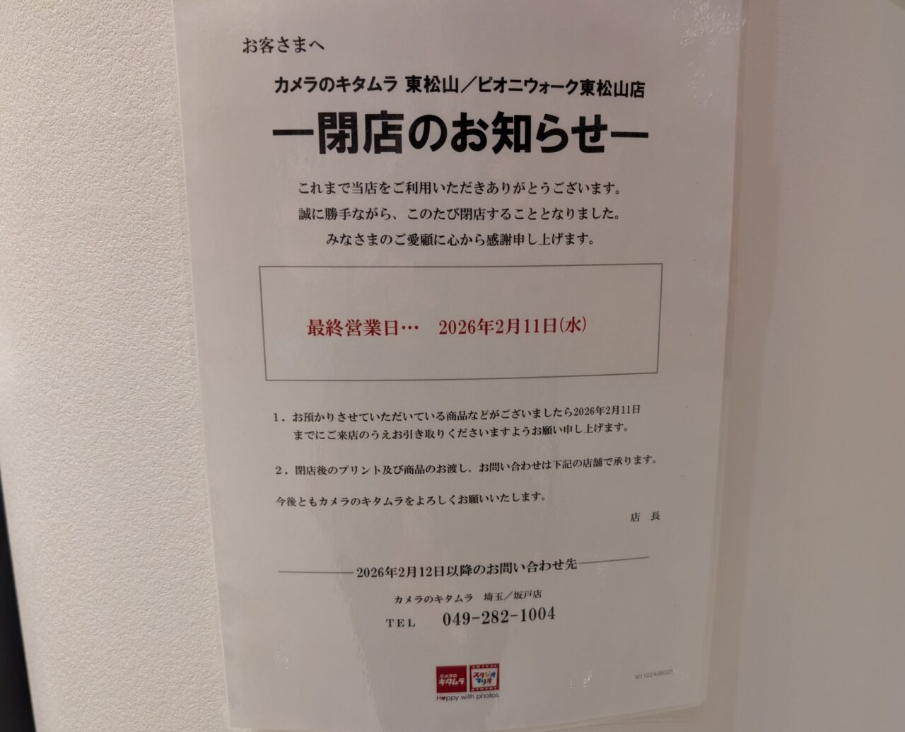 2025年12月、1階に期間限定ショップのかさや傘とレストラン街に銀座惣菜店が新しくオープンしたピオニウォーク東松山ですが、残念ながら閉店してしまうお店の情報も入りました。ホームぺージのお知らせにも記載の通り、2階のアパレルショップ「UNION 東松山店」と1階の「カメラのキタムラ ピオニウォーク東松山店」が閉店されるとのこと。店頭でもすでに閉店のお知らせが掲示されていました。「UNION」の最終営業日は、2026年2月1日(日)とのこと。お店では閉店セールが行われていますので、お出かけの際は立ち寄ってみてはいかがでしょうか?「カメラのキタムラ」の最終営業日は、2026年2月11日(水・祝)とのことです。近隣店舗には坂戸店がありますので、営業終了後は坂戸店をご利用ください。どちらのお店も利用されていた方にとっては、とても残念なお知らせですね。ご利用予定の方は最終営業日をご確認ください。