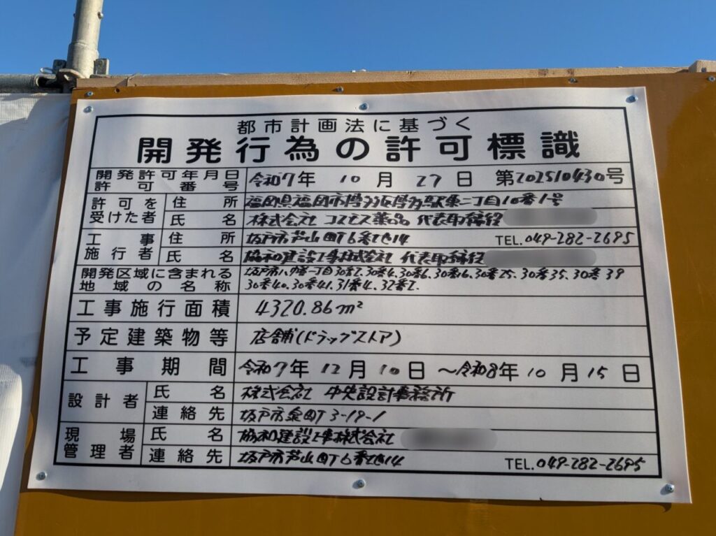 先日、こちら号外NET坂戸市・鶴ヶ島市・東松山市でお伝えいたしました、坂戸市八幡にオープン予定の「ドラッグ コスモス 坂戸八幡店」についてですが、2026年1月上旬に現地を通りかかったところ、工事の看板(都市計画法に基づく開発行為の許可標識)が付けられており、オープン予定地を確認することができました。