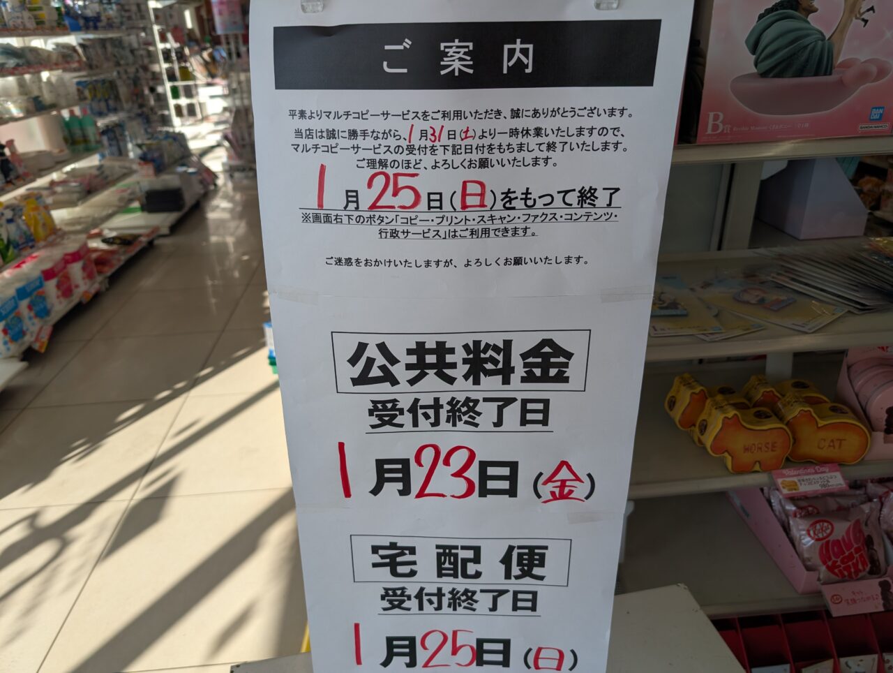 また、公共料金の受付は1月23日(金)まで、宅急便の受付は1月25日(日)までとなっていますので、ご注意ください。