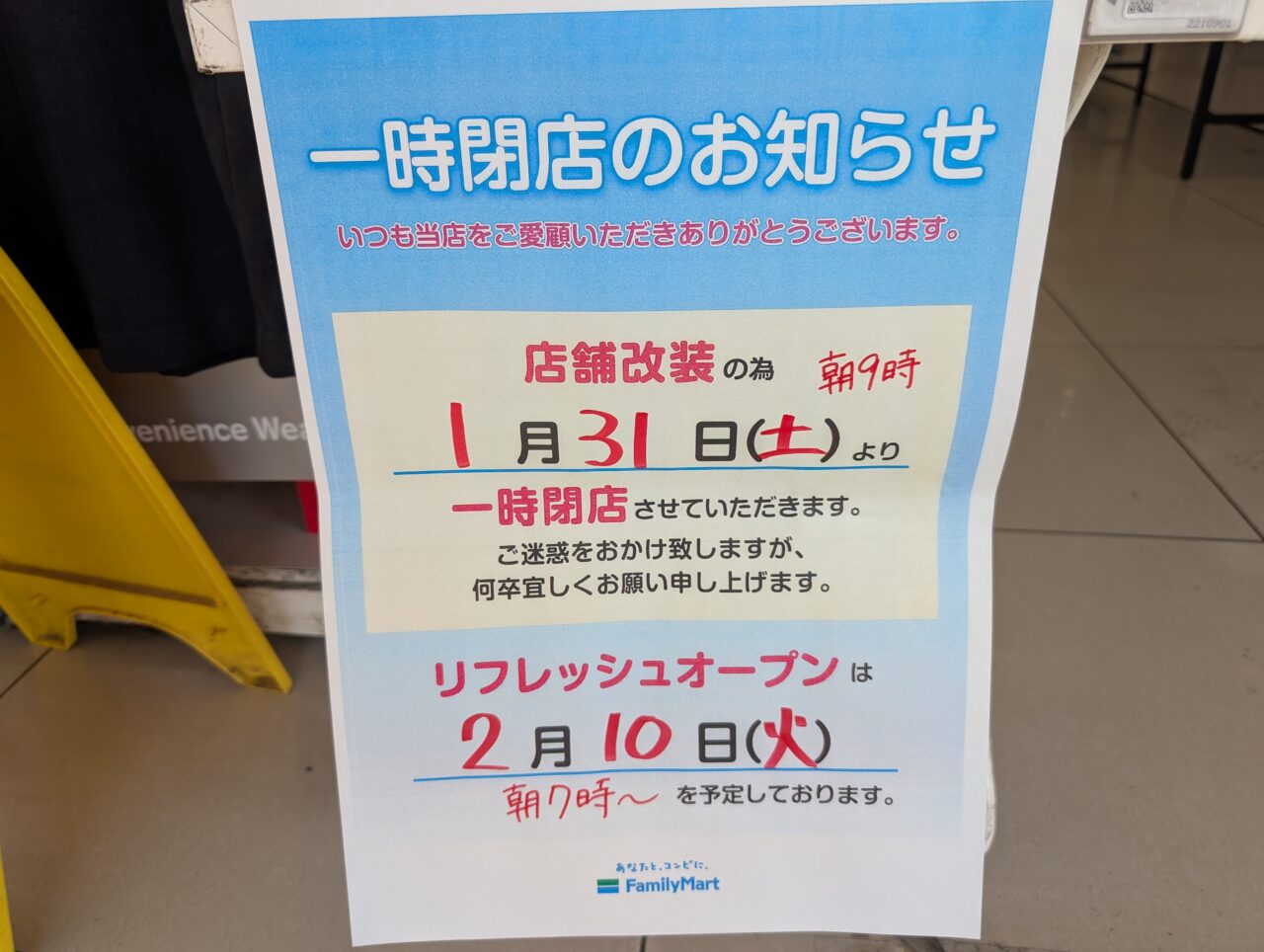 テスラオーナーのみなさまにとっても便利なコンビニですが、店舗改装のため2026年1月31日(土)朝9時より一時休業することがわかりました。リフレッシュオープンは、2月10日(火)7:00の予定とのことです。