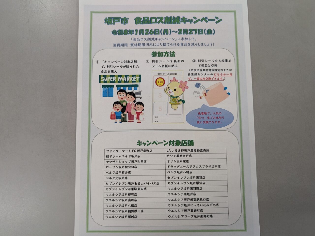食品を取扱う店舗や各家庭から廃棄される食品を減らすため、値引きシールの貼られたものを購入するのも食品ロス削減の方法の一つですが、坂戸市では2026年1月26日(月)〜2月27日(金)まで「坂戸市 食品ロス削減キャンペーン」を実施しています。