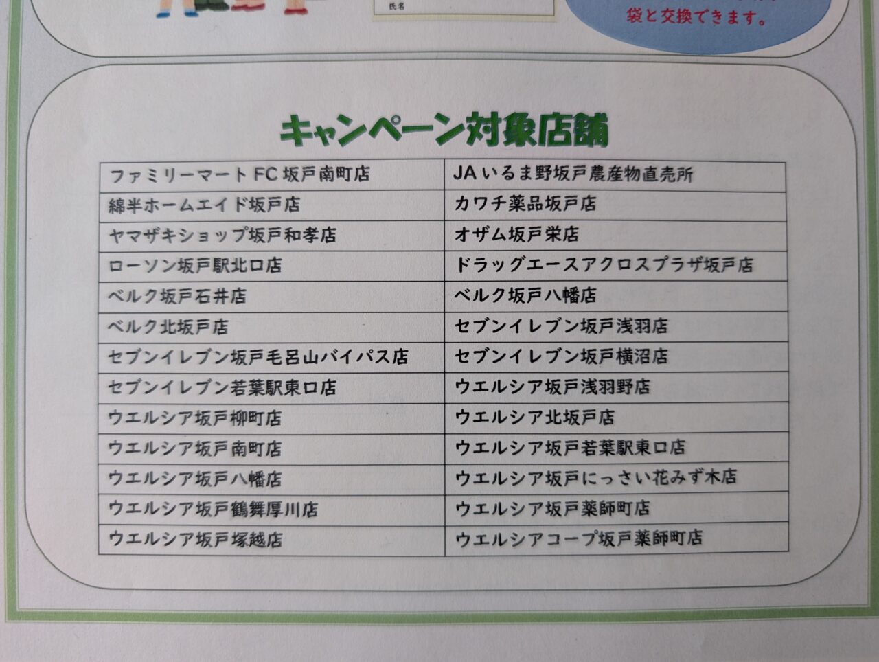 坂戸市にお住まいの方を対象に、期間中、対象店舗にて値引きシールが貼られた商品を購入し、キャンペーンチラシ裏面の台紙に値引きシールを貼り、6枚集めると景品と交換することができます。