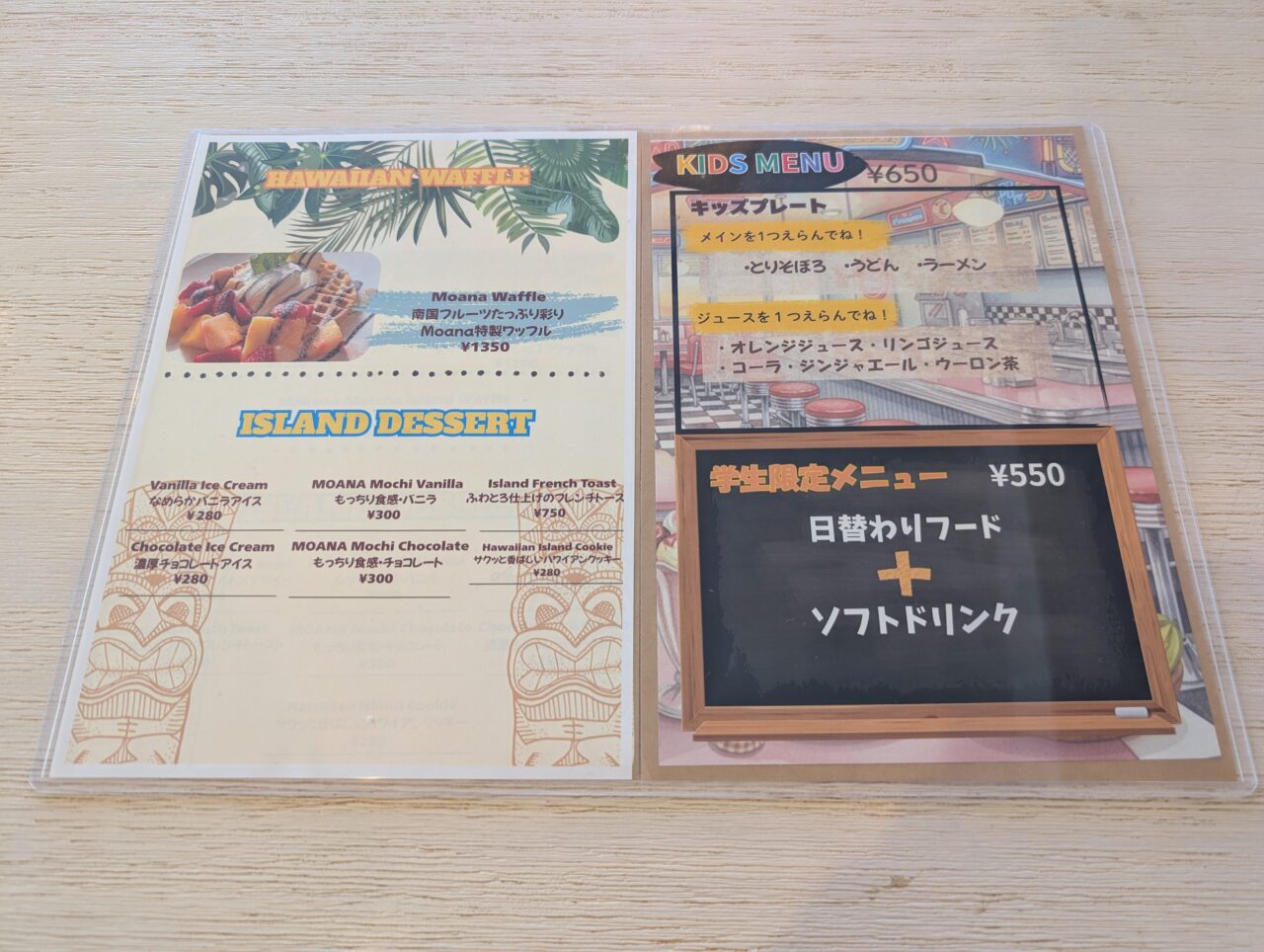 2026年1月4日(日)、鶴ヶ島市新町にハワイをテーマにしたカフェダイニング「MOANA」がオープンしました。店内のBGMやインテリアからもハワイの雰囲気を感じられます。海好きという店主様ご夫妻が、海なし県の埼玉でハワイの風を感じられる場所としてみなさんが気軽に訪れることができることをコンセプトにしているそうです。お子様連れの方も安心できる、広々としたキッズスペースがあることも特徴。キッズスペースに近い席もあり、お子様連れの方はこちらの席に案内をしているとのことでした。メニューにもハワイの雰囲気がたっぷり。試行錯誤中とのことで、新メニューも検討しているとのことでした。プレートは、サイドメニューとして単品でもいただけるそうです。お酒やドリンクも充実しており、こちらのお店は昼、夜の通し営業をしているそうですが、ランチ、カフェ、ディナーのどの時間帯にもぴったりです。メニューの中でもカレーにはこだわりがあるとのことで、今回は、とろとろ豚角煮のハワイアンカレーを注文しました。まろやかな味わいですが、あとからスパイスの辛さを感じられる味わい深いカレーでした。角煮も脂を落としてしっかりとホロホロに煮込んであり、カレーとの相性も抜群食べ応えのある一品です。海老好きの方には、有頭海老まるごと煮込んだ海老のだしが効いた「海老だし旨みたっぷり南国カレー」もおすすめとのことでした。デザートメニューや学生限定メニューも必見です。キッズプレートも充実しており、鶏そぼろごはん、うどん、ラーメン、カレーから選べ、日替わりの付け合わせとデザートも付いた、盛り付けもかわいらしい豪華なプレートです。また、テラス席はペット連れでも利用できるようになったそうです。注意事項をご確認の上、ご利用ください。