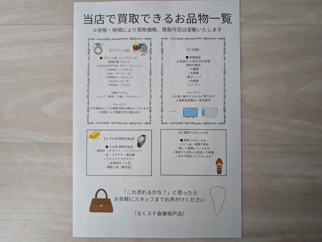 2025年10月に、ごみの削減を目的に坂戸市との官民連携のリユース拠点として「株式会社 宇津木金属」が運営する「ジモティースポット 坂戸店」がオープンしました。不用品を提供する市民の方々やリユース品をお手頃価格で購入したい方などが訪れ、ごみの削減に貢献する話題のスポットとなっています。そして、同じく「株式会社 宇津木金属」が運営する新たなリユース拠点として、「ジモティースポット 坂戸店」の2階に2026年2月5日(木)、「なくステ倉庫」がオープンしました。入口は、建物の正面に向かって左手の階段を上った場所にあります。こちらは、非鉄金属回収や産業廃棄物リサイクル事業を行なっている「株式会社 宇津木金属」が、「捨てるをなくす」=「なくステ」をテーマに取り組む事業で、事業を行う過程で企業などから買い取ったリユース品などを販売する実店舗としてオープンしました。こちらでは家具や家電、ブランド品、希少品など、多岐にわたる商品を取り扱います。こちらにある商品は一部とのこと。商品はメルカリshopsジモティーにも出品されているとのことで、そちらでも在庫を確認することができます。(※画像の商品は取材当時のものです。記事の公開時点ですでに売却済みの商品もあることが考えられますので、ご了承ください。)こちらのお店では、企業や業者から直接買取、販売を行うため、リーズナブルな価格で提供できることも特徴なのだそうです。店頭での買取も行っているとのことで、買取可能なものは、以下のとおりです。その他の品物につきましては、ご相談くださいとのことでした。また、オークションでの仕入れルートも確保しており、購入代行のご相談も承っているとのことで、探している品物がなかなか手に入らない方や購入代行をご希望の方は、スタッフさんまでお問い合わせください。また、持ち帰りが困難な家具・家電の配送も行っているとのこと。基本料金は以下のとおりですが、個数や大きさによっては追加料金が発生する場合もあるとのことでした。運営の仕方や商品の内容が異なる1階の「ジモティースポット」と2階の「なくステ倉庫」ですが、ともにごみを減らすリユース拠点として、今後さらに地域のみなさまに重宝されるスポットとなりそうですね。お会計はキャッシュレスにも対応していますので、思わぬ商品との出会いも安心して迎えられますね。お宝探しのようなワクワク感を感じられる新たなリユース拠点「なくステ倉庫」を、ぜひみなさまもご活用ください。