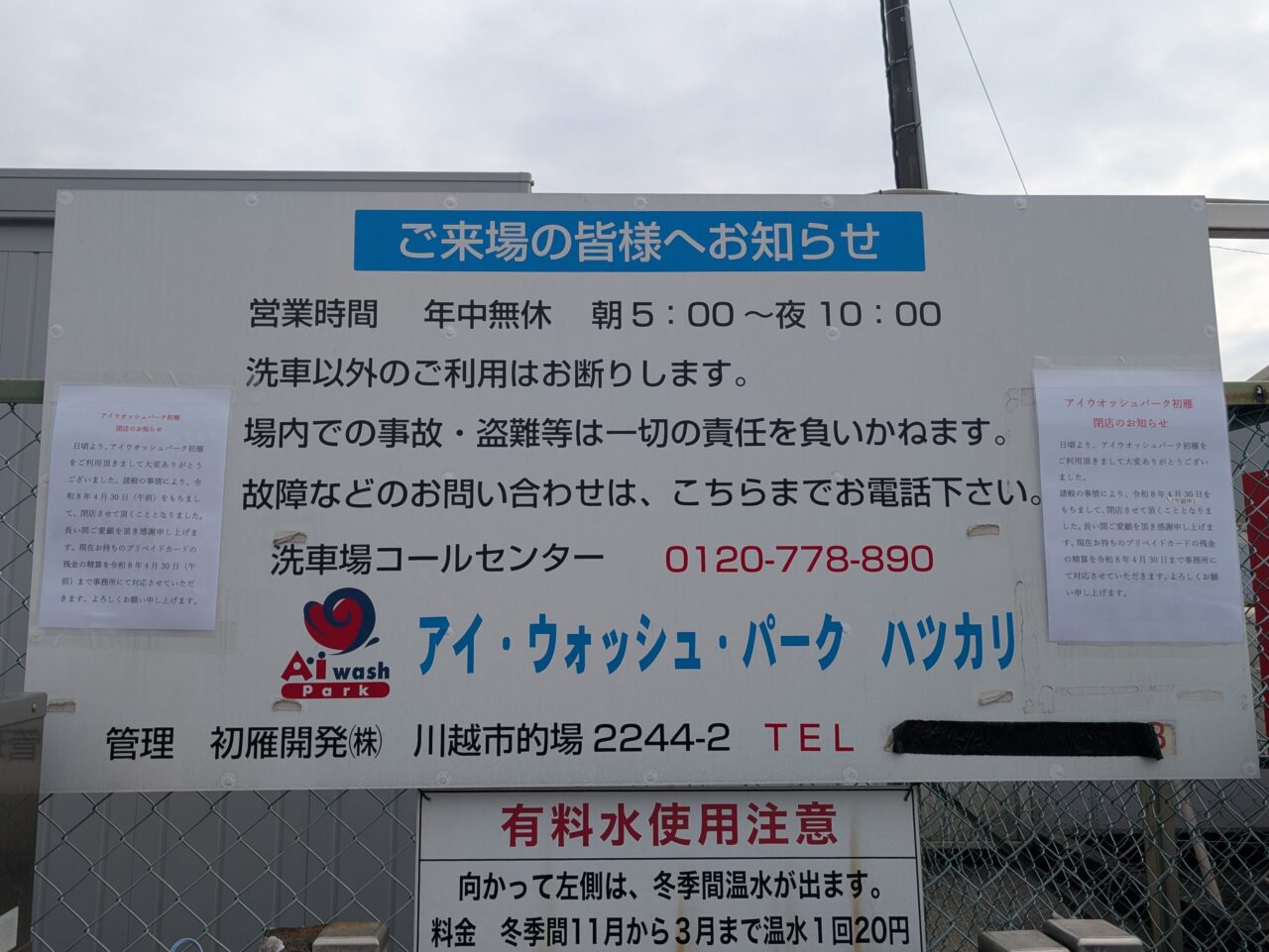 【鶴ヶ島市】管理人様からみなさまへ。市役所近くの洗車場「アイ・ウォッシュ・パーク ハツカリ」が4月30日(木)をもって閉店となります。