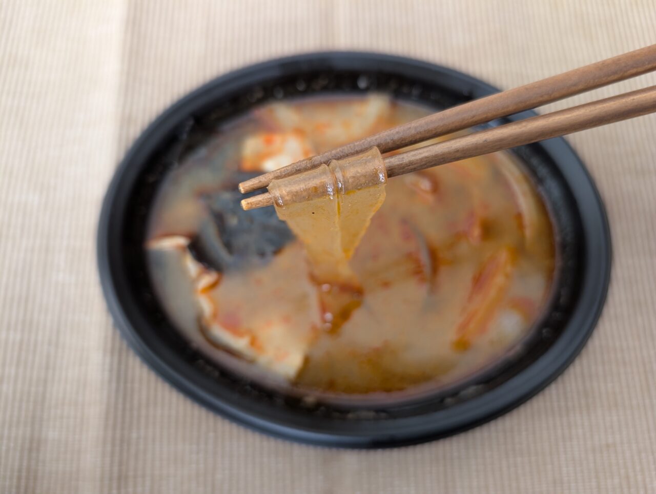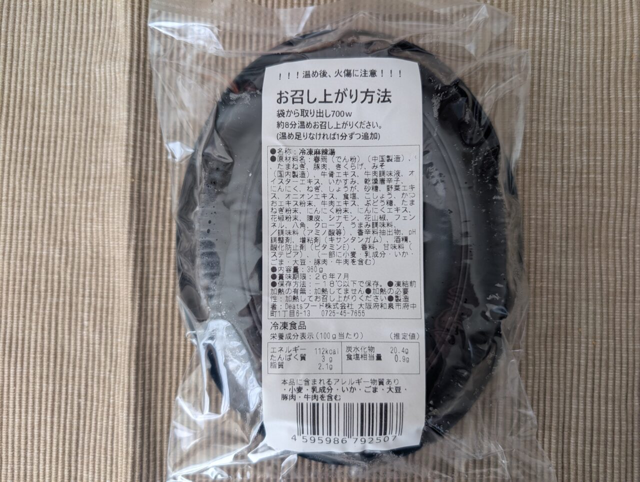 こちらも冷凍の状態で販売されており、袋から取り出し、レンジ(700w8分)で温めるだけで簡単に麻辣湯をいただけます。