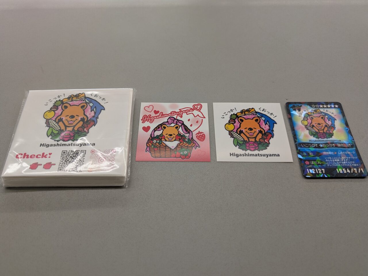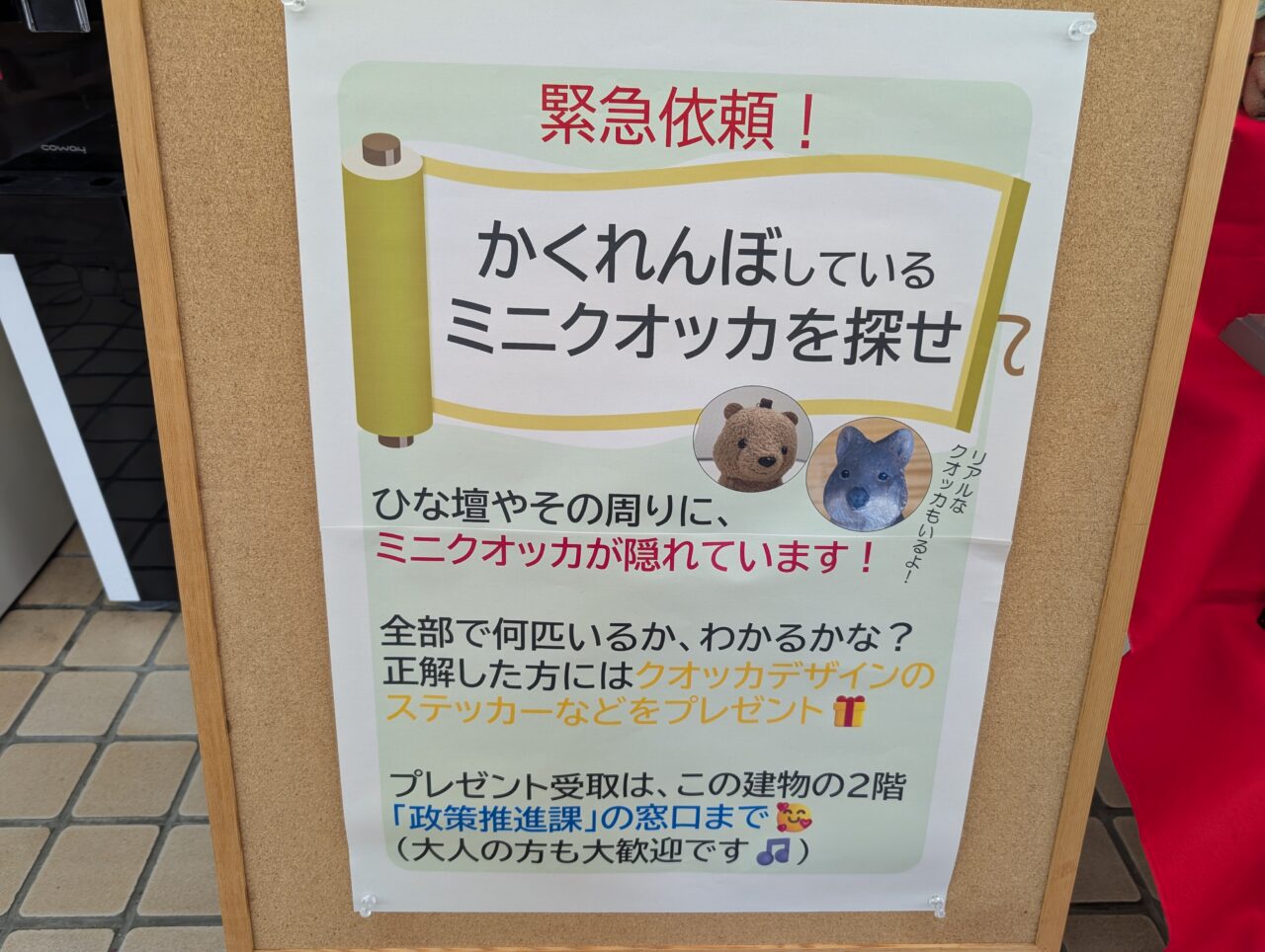 また、ひな壇に隠れているミニクオッカが何匹いるかに正解すると、クオッカデザインのステッカーなどから1つプレゼントがいただけます。受取場所となっている2階の政策推進課にて、実物を見せていただきました。(ひな壇とともに、こちらへの掲載許可をいただいております。)