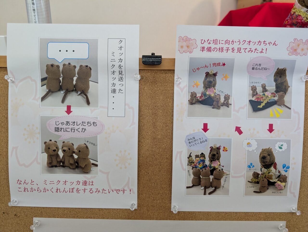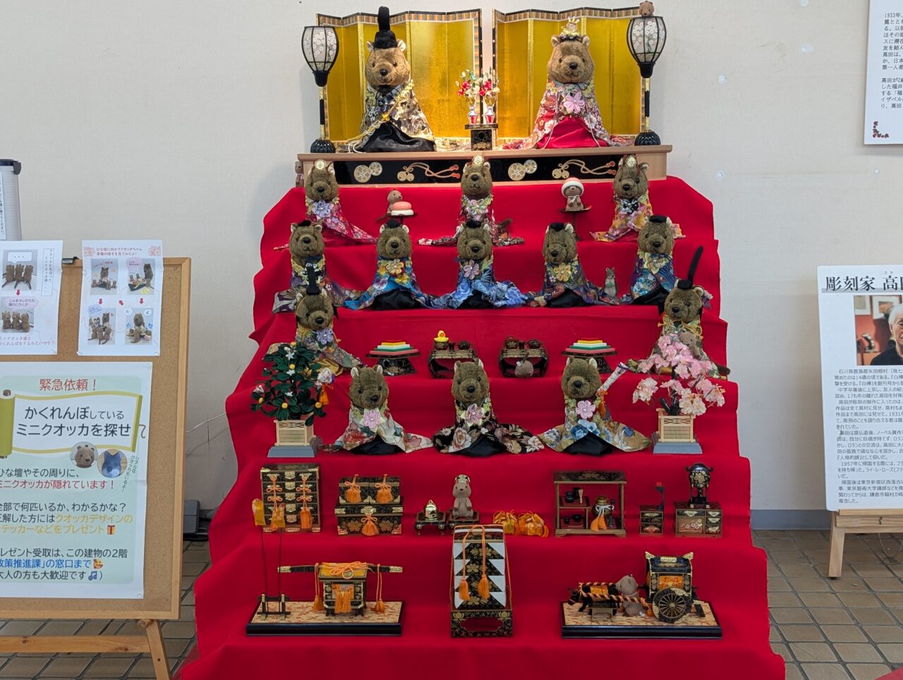 東松山市役所1階ロビーでは、クオッカのひな壇が2026年3月2日(月)より登場し、来庁者の方々を楽しませてくれています。今年は3月13日(金)まで展示されるとのこと。