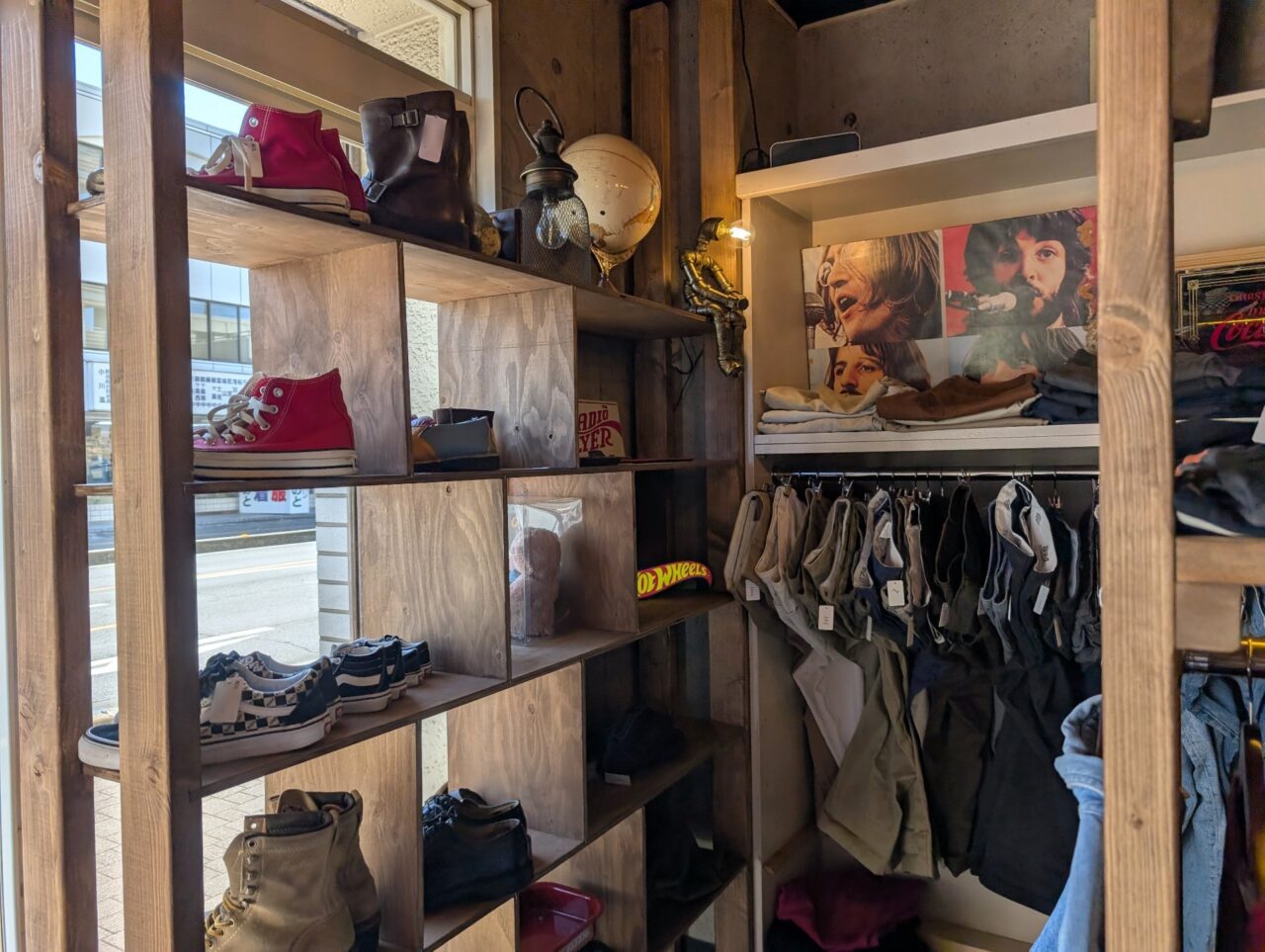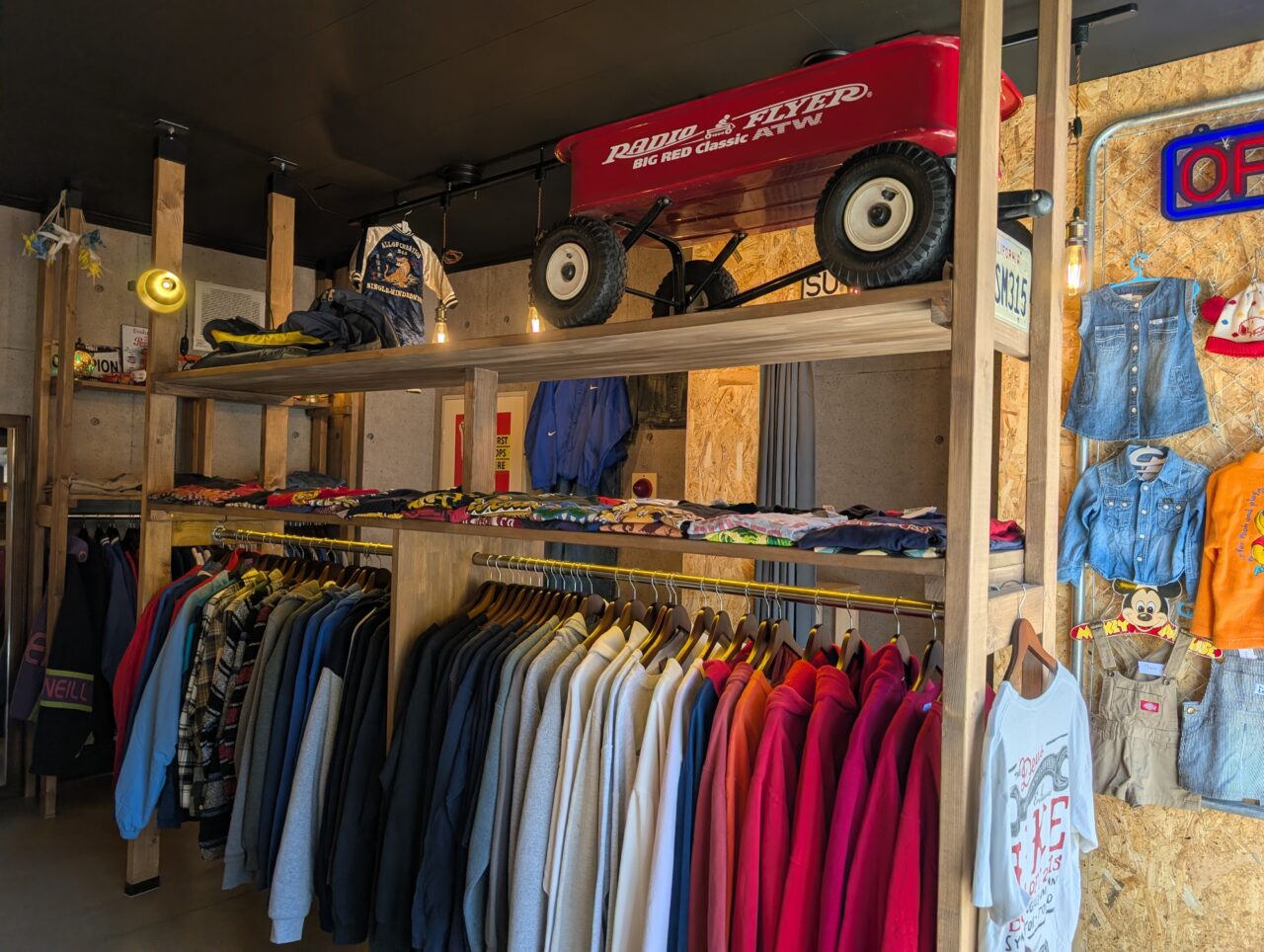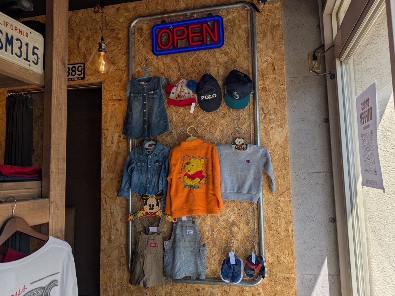 店内には、地元のご出身という店長様が厳選した男女問わず着用できるTシャツや帽子、スニーカーなどの古着が並び、特にアメカジスタイルやストリートファッションを取り入れたい方などにはぴったり。一部子供服もあり、おしゃれ好きのパパさん、ママさんも必見です。
