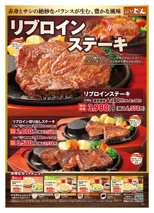 リニューアルオープンを記念して、3月19日(木)〜4月30日(木)までステーキのどん自慢の柔らかさとジューシーさにこだわった「リブロインステーキ」をリニューアル感謝価格で提供しているとのこと。お祝いシーズンのこの時期にもぴったりなメニューですね。