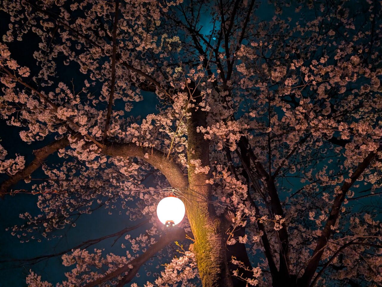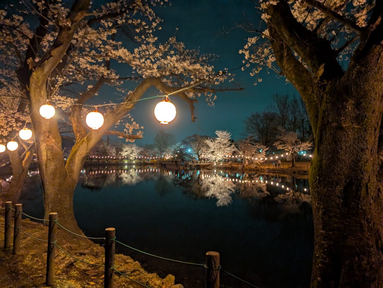 太田ヶ谷沼をぐるりと囲むように設置された提灯の温かな灯りが、満開の桜を水面に映す幻想的な光景は、この季節だけの特別なお楽しみです。3月27日(土)夜は、ほぼ満開の様子でした。