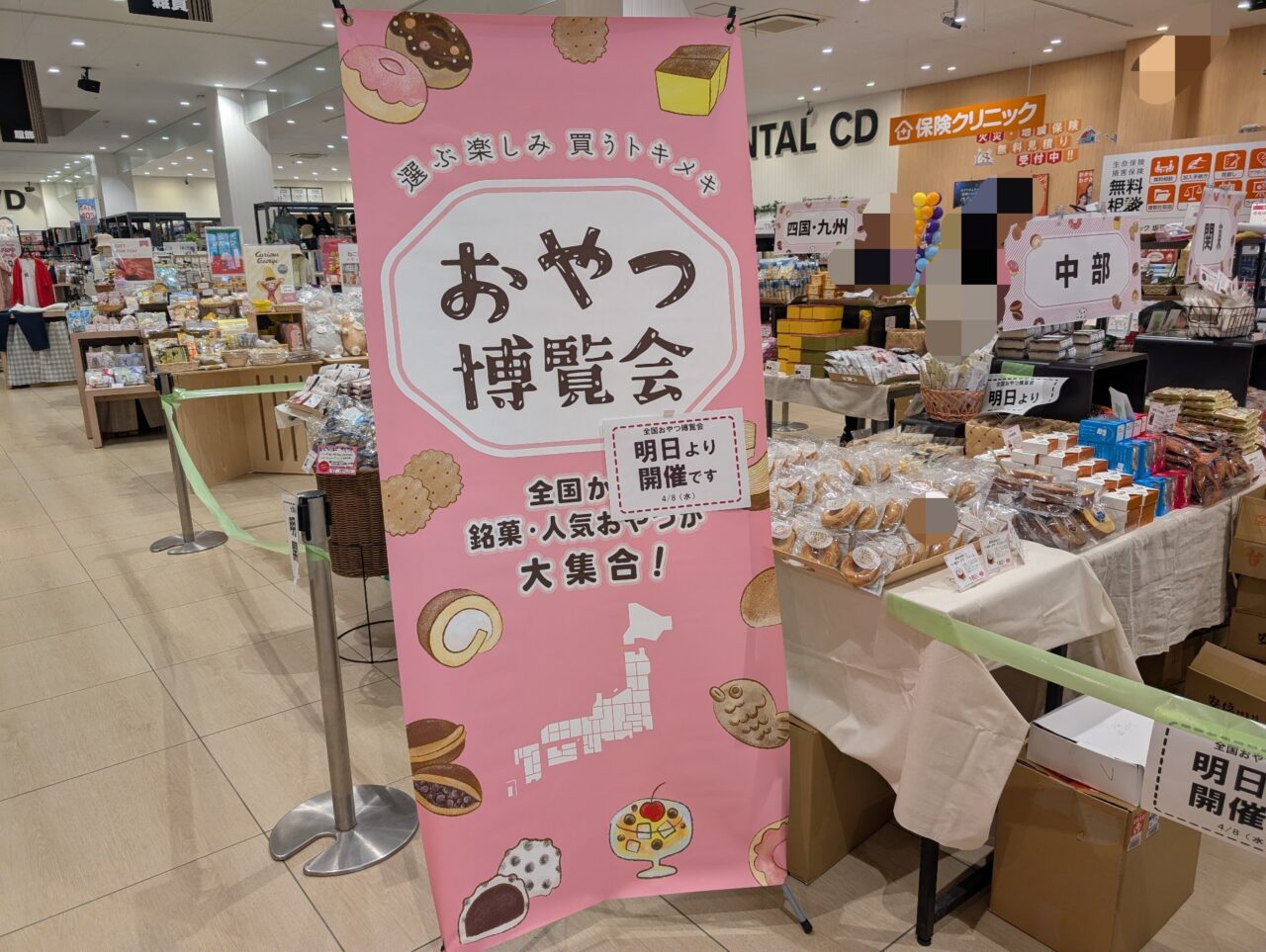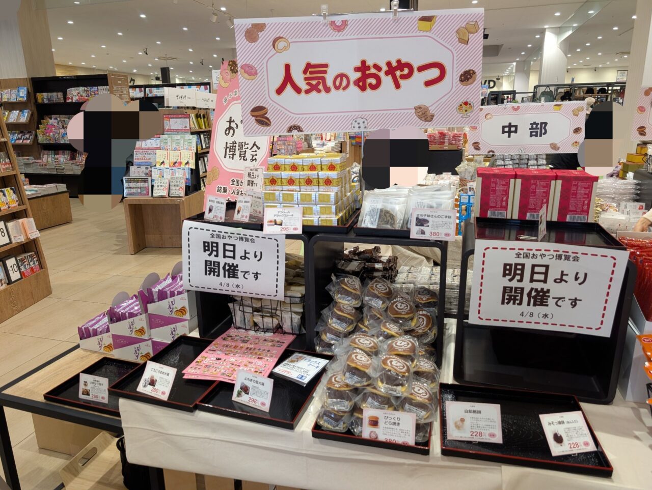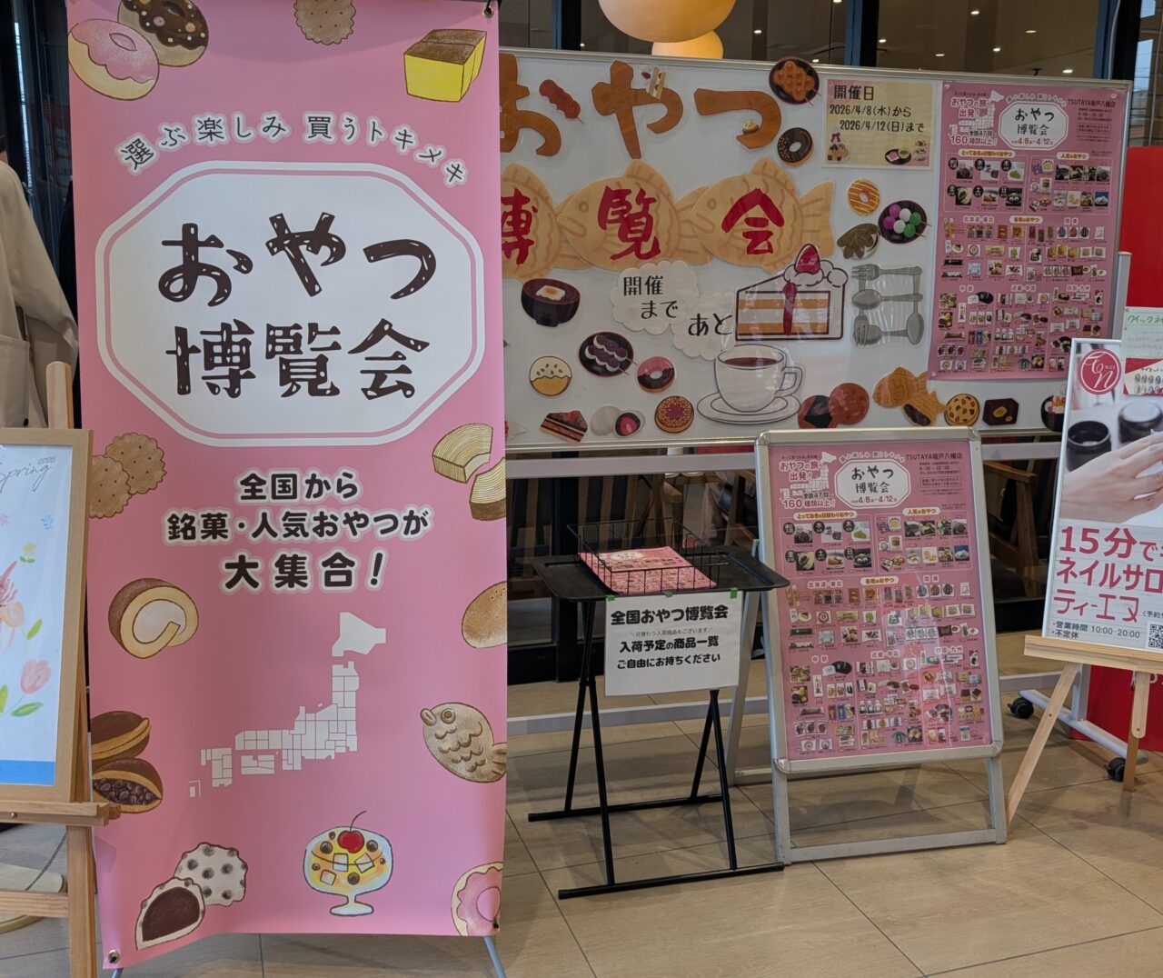 店舗入り口では、「全国おやつ博覧会」に向けたお知らせが大きく掲示されており、多くのお客様が足を止めてご覧になっていました。
