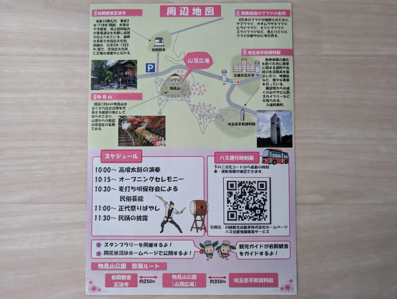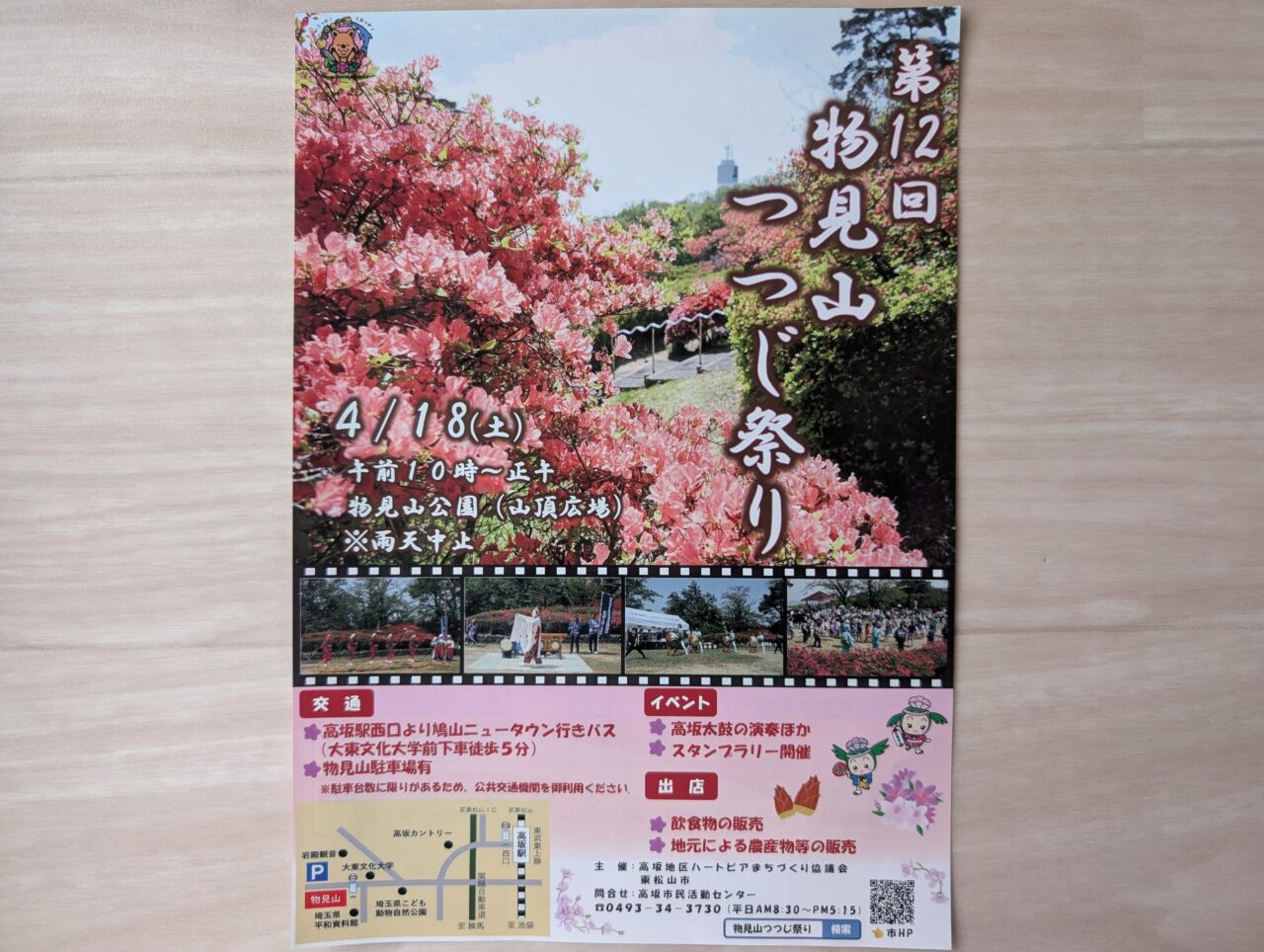 東松山市岩殿の物見山公園では、つつじの花が見頃を迎えており、色鮮やかなお花とグリーンのきれいなコントラストが今年も多くの方々を楽しませてくれています。本日(2026年4月18日(土))10:00〜正午には、山頂広場にて「第12回 物見山つつじまつり」が開催される予定となっており、太鼓の演奏などの他、グルメや農産物の出店、スタンプラリーなどを楽しむことができるとのこと。物見山駐車場を利用することができますが、数に限りがありますので、バスでのご利用をおすすめいたします。イベント開催前日にはまだつぼみのつつじもありましたので、おまつりが終わってもしばらくの間はつつじを楽しむことができそうです。ハイキングをしながら、この季節だけの景色をぜひ楽しんでみてはいかがでしょうか?