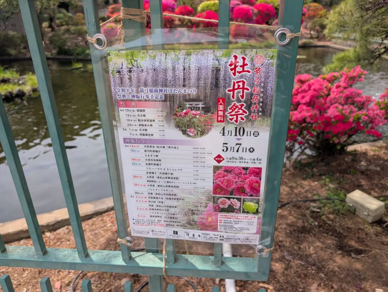 東松山市の花・ぼたんを観賞することができる市内有数のスポット「箭弓稲荷神社」の牡丹園では、2026年4月10日(金)〜5月7日(木)まで、恒例の牡丹祭(入場料無料)が開催されています。今年も見頃を迎えた色とりどりのぼたんが園内を彩ります。大ぶりで華やかなぼたんの花は、うっとりするような美しさでみなさんを楽しませてくれています。また、ツツジや藤の花も同時に見頃を迎え、園内はより一層華やかな雰囲気に包まれていました。筆者が伺った4月17日(金)は、藤棚の池側の藤の花が見頃でしたが、入口側の藤も蕾をたくさん付けており、しばらくの間楽しむことができそうでした。気持ちのよい気候の中、園内を散策しながらのお散歩は、季節を感じるひとときになるでしょう。みなさまも「箭弓稲荷神社」の牡丹祭にお出かけになってみてはいかがでしょうか?なお、御祈願は9:30〜16:00(受付9:00〜15:50)までとなっています。祭典や神賑行事も随時行っていますので、そちらもぜひご確認ください。●「箭弓稲荷神社」はこちらです