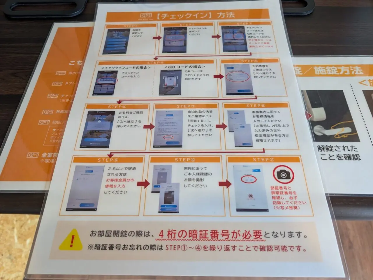 お部屋の解錠にはタブレット端末に表示された4桁の暗証番号が必要なため、メモや写真撮影をおすすめいたします。